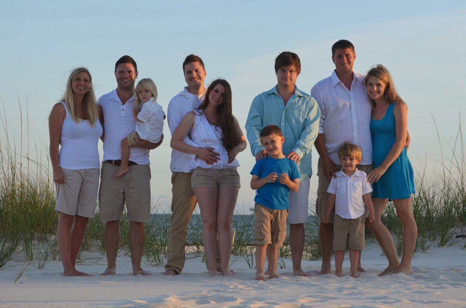 Our first full day at the beach house was perfect. The three little cousins had fun burying one another in the sand and chasing a crab they collectively named Crab Apple Peanut Butter. Eric found himself swimming next to a sting ray, and my sister-in-law and I enjoyed watching the dolphins frolic and flip right out in front of us. The smell of sunscreen, salty kisses and sand in every crack and crevice of our bodies was a constant reminder that we were exactly where we wanted to be. That night we gathered up the entire clan for some family pictures.