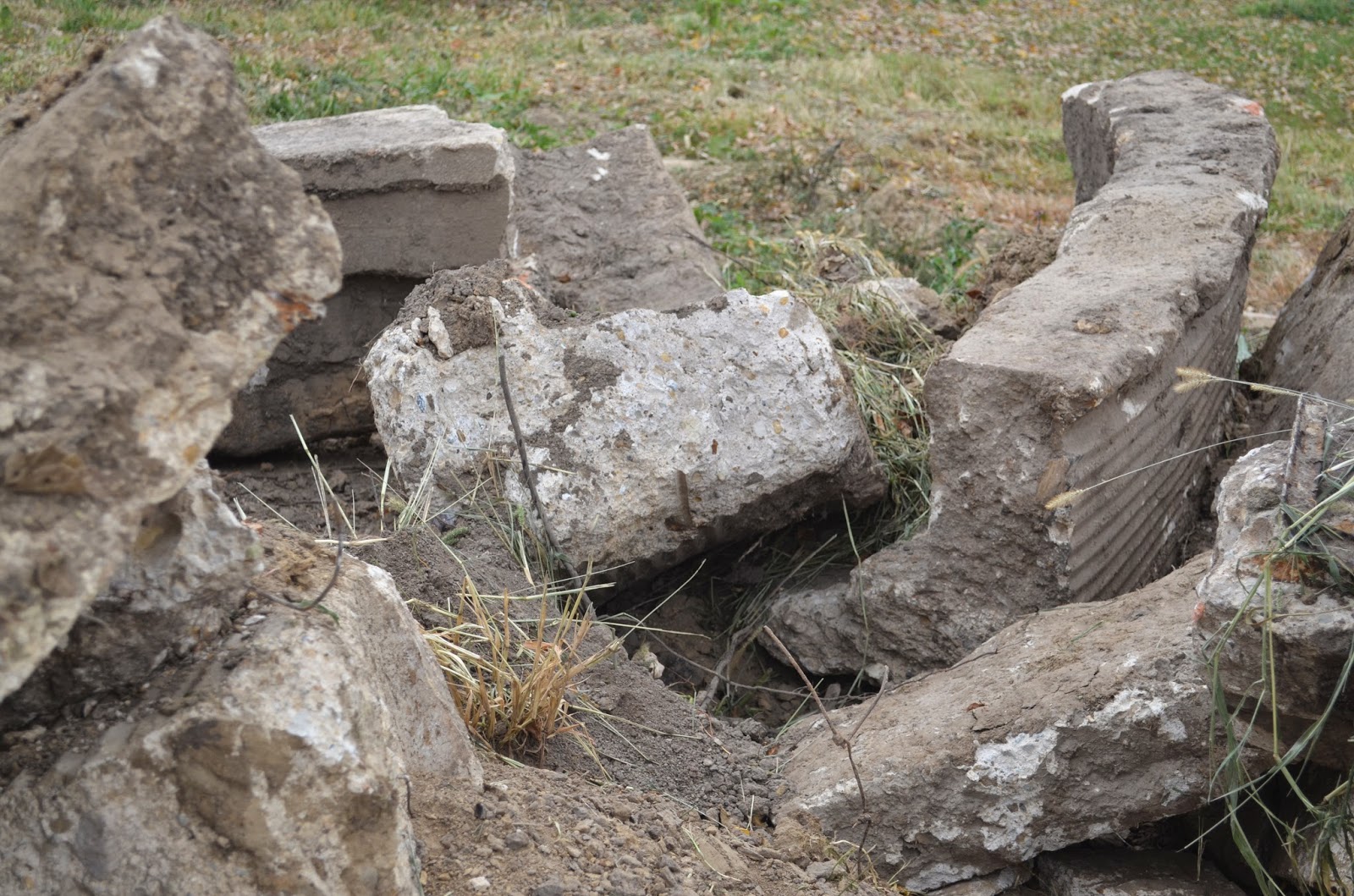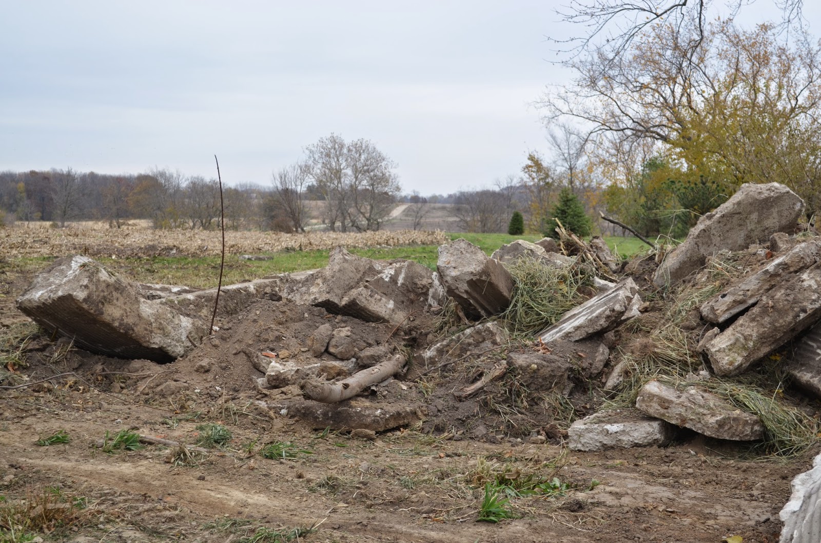 In order to build this shed, we needed to break up a concrete slab that remained from a pre-existing structure on the land. It actually looked like mini ancient ruins, overrun with weeds, tall grass, and random trees protruding from the cracked concrete. With a back hoe and a manly growl (what I like to compare to a gorilla beating his chest) my main squeeze busted up that concrete into chunks of hard gray rubble. Then, he immediately cleared the rubble away by moving it next to the road, where he can jack hammer it apart later into rock that he can lay as the floor of the building.
